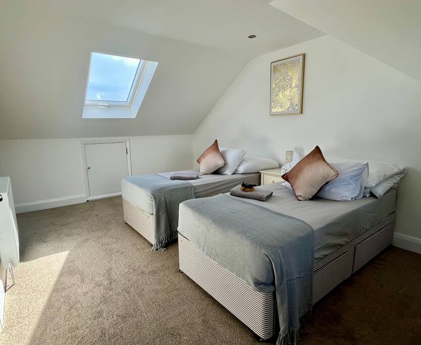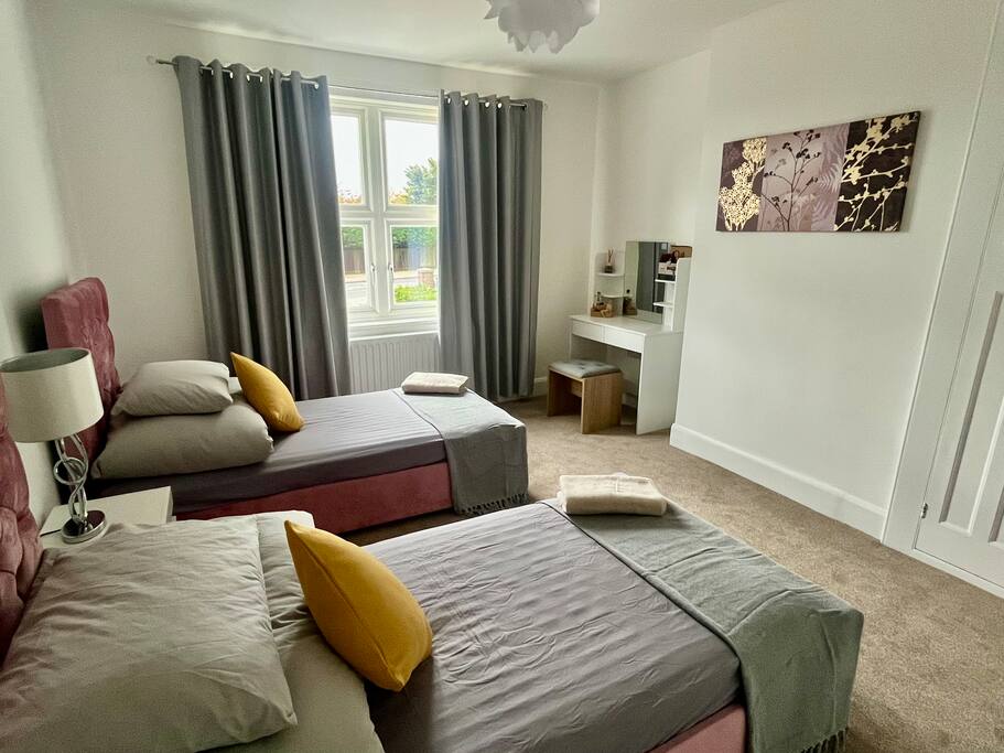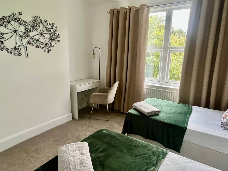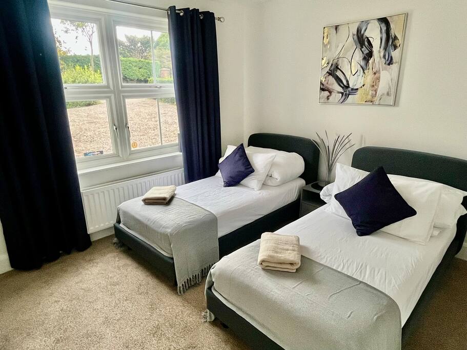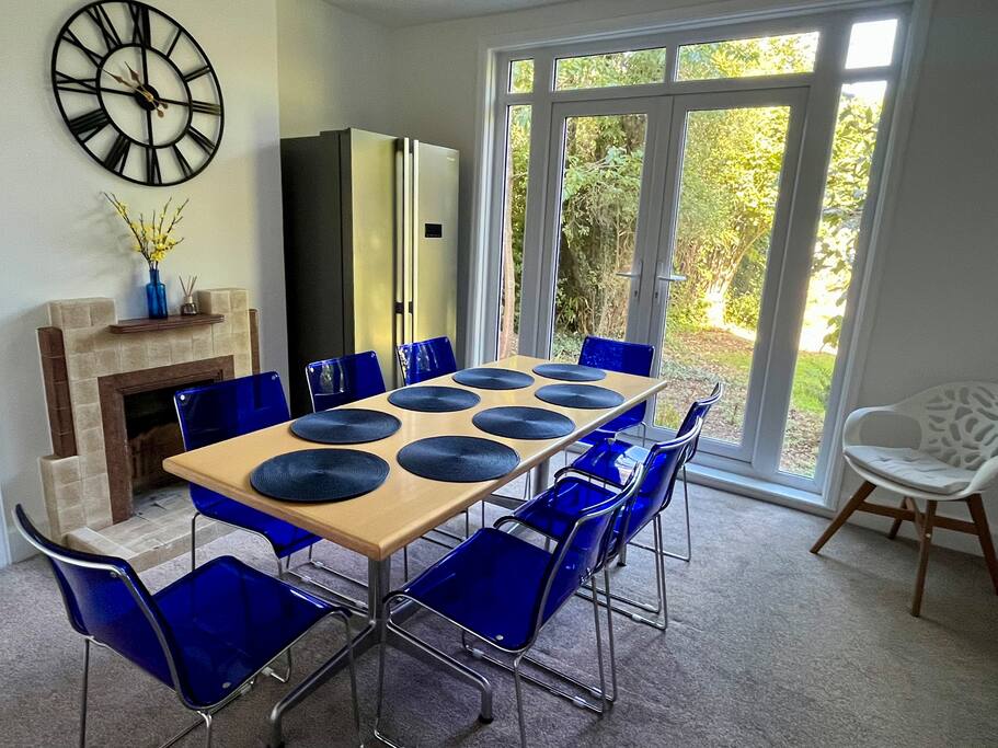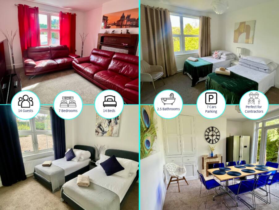 - 7 bedrooms, 14 beds, Dedicated living room and dining room. Ideal for contractors, professionals, relocators, and large groups. Plenty of space for everyone to enjoy comfort and privacy - Bedroom 1: 2 x single beds. - Bedroom 2: 2 x single beds or 1 x king size zip & link bed. - Bedroom 3: 2 x Single beds. - Bedroom 4: 2 x Single beds. - Bedroom 5: 2 x single beds. - Bedroom 6: 2 x single beds or 1 x super king size zip & link bed. - Bedroom 7: 2 x single beds or 1 x king size zip & link bed - Spacious Living Room – Relax with two comfortable sofas and a 55" Smart TV for your entertainment. - Dedicated Dining Room – Enjoy meals in a large dining area with a beautiful view of the garden. Each bedroom is designed with flexibility in mind, with a mix of zip & link beds (singles or kings), perfect for teams or families. Details available upon request. - 2 modern bathrooms & 4 toilets Clean, bright bathrooms with fresh towels and complimentary toiletries. - Fully equipped kitchen Fridge, oven, microwave, and all essential cookware Great for meal prepping or shared dinners - Work-friendly spaces Quiet zones ideal for remote work or business use - Free Allocated Parking with 24/7 Security Cameras Spacious Parking area for up to 7 vehicles – a major advantage for contractor teams! - Prime location: Situated in a peaceful residential area with easy access to transport links, local shops, and takeaways Extra amenities: ✅ Superfast Wi-Fi ✅ Central heating ✅ 2xWashing machines, Tumble Dryer & essentials provided