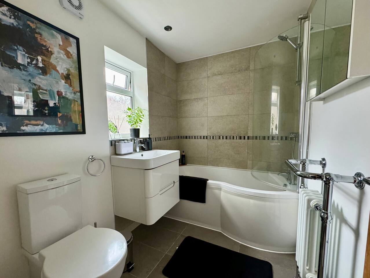 - 3 large bedrooms, 6 beds Ideal for families, contractors, relocators, and groups Plenty of space so everyone can enjoy a restful stay - Spacious living room Bright and open with comfortable seating—great for relaxing or socializing Includes a 50-inch Smart TV with Netflix for entertainment - Modern bathrooms Large bathtub and shower Fresh towels and complimentary toiletries provided - Fully equipped kitchen Includes fridge, oven, microwave, and all essential cookware Perfect for cooking full meals or quick snacks - Dedicated workspace Quiet and comfortable areas for remote work or business use - Allocated PARKING space A huge bonus is the parking space at the rear of the property - Free on-street PARKING Plus one visitor parking permit for on-street parking. - Great location in Maidstone Peaceful residential setting just a 10-minute walk to the High Street. Surrounded by pubs, takeaways, and pizza places within walking distance - Extra amenities Fast Wi-Fi, central heating, and a washing machine for your convenience The sunny rear garden with a patio is ideal for enjoying the afternoon sun.