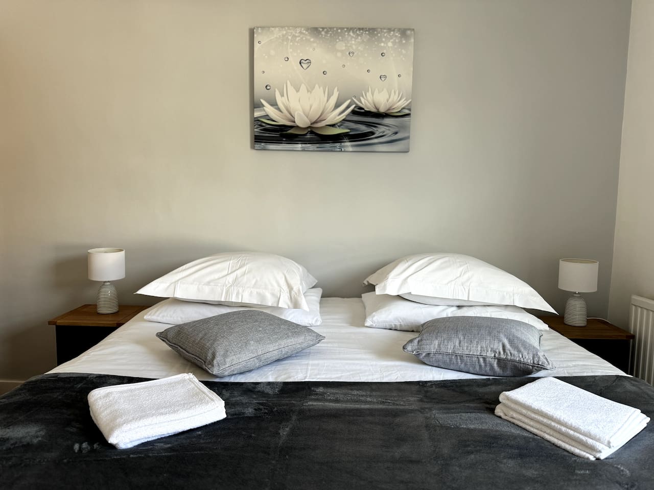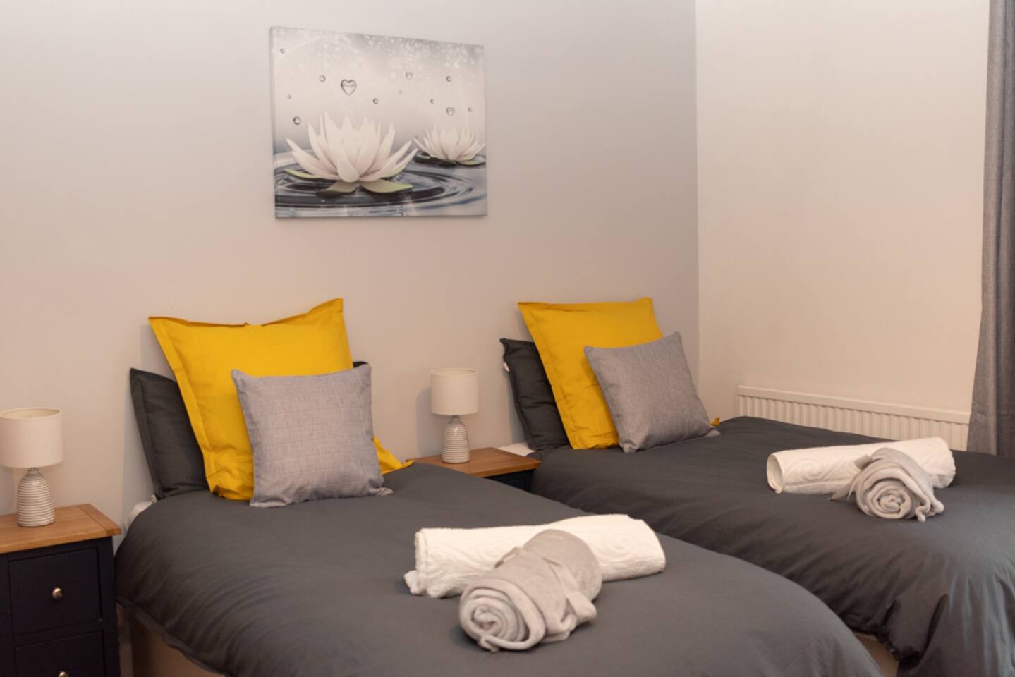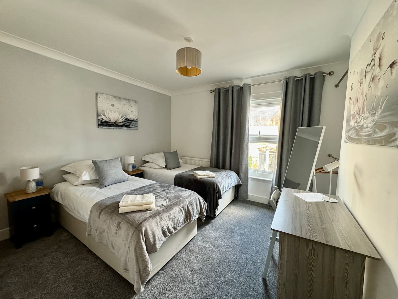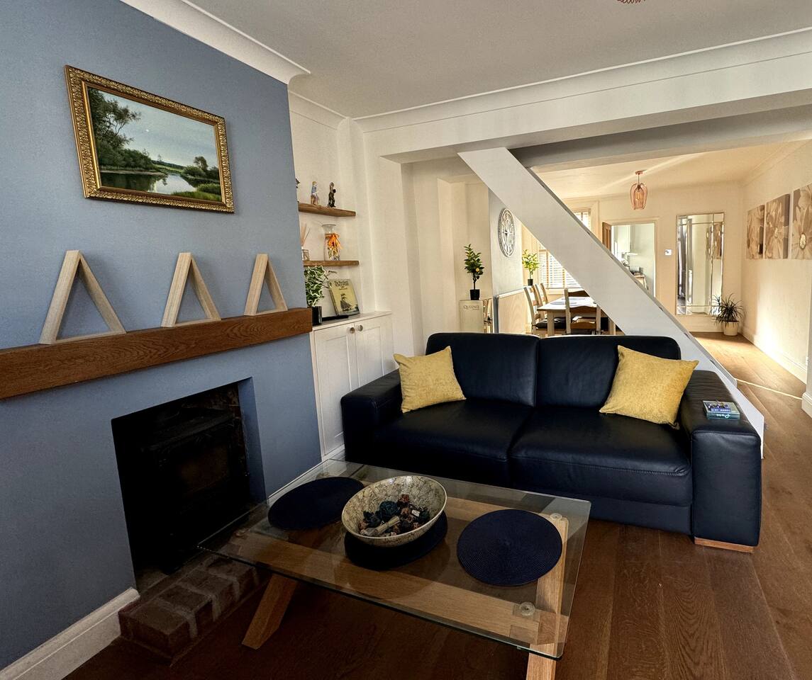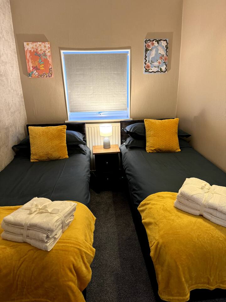 Welcome to our beautiful home - perfect for both LONG-TERM STAYS and relaxing short getaways. Spacious and stylish 3 bedroom house Up to 7 guests Upstairs there are 3 bedrooms with the third being accessed through the rear bedroom. Bedroom 1: 2 x single beds or 1 x super king zip & link bed Bedroom 2: 2 x single beds Bedroom 3: 2 x single beds or 1 x king zip & link bed Living room: 1 x leather sofa bed, coffee table and 50" flat-screen TV